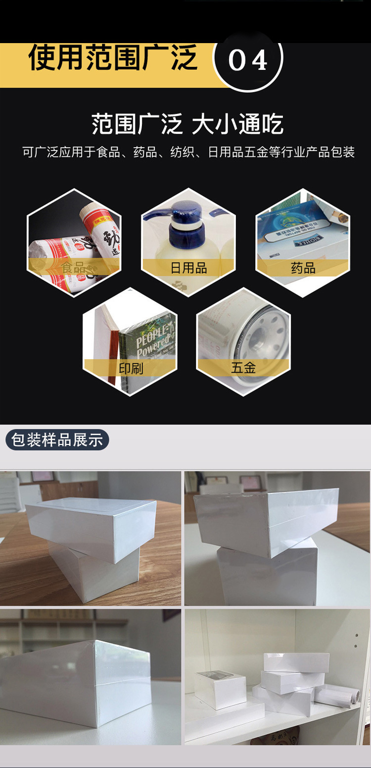 • 包裝質量好:熱收縮膜緊密包裹產品,能有效密封、防潮、防污染,并保護商品免受外部沖擊,具有一定緩沖作用,還可減低產品被拆、被竊的可能性 1