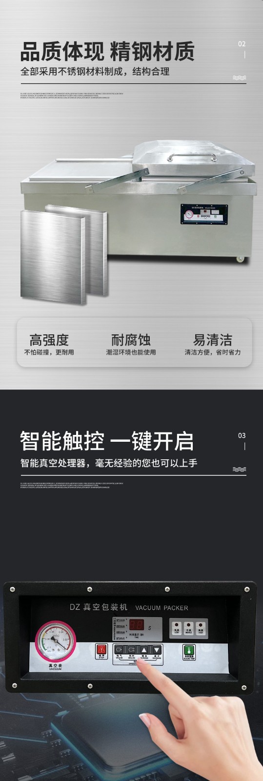 - 材質(zhì):優(yōu)質(zhì)品牌通常采用 304 不銹鋼制作機身和真空室,如諸城冠通機械的 600 型素肉雙室真空包裝機,其真空室采用超厚 304 不銹鋼板,厚度達 4mm,長期使用不變形、不漏氣13。而一些低價品牌可能使用普通不銹鋼甚至是鐵材質(zhì)外包不銹鋼皮,容易生銹腐蝕,影響機器壽命和包裝質(zhì)量。