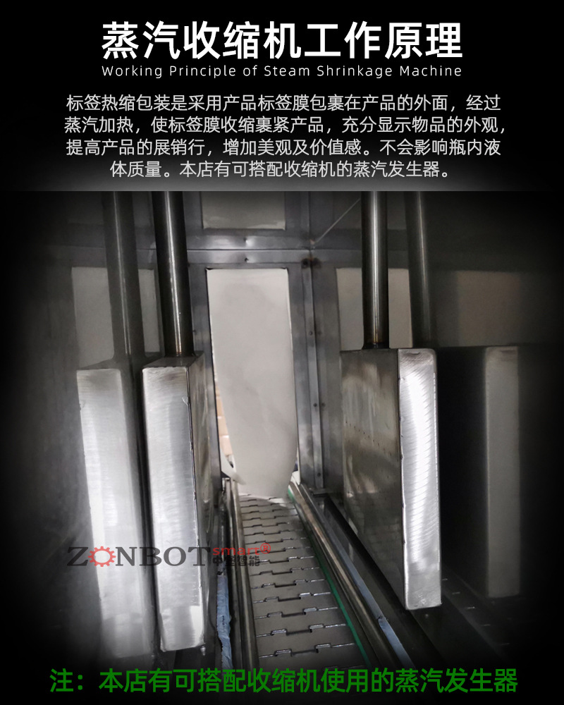 蒸汽收縮機多采用不銹鋼網材質,且為無級調速,輸送速度可任意調節,能適應不同包裝需求