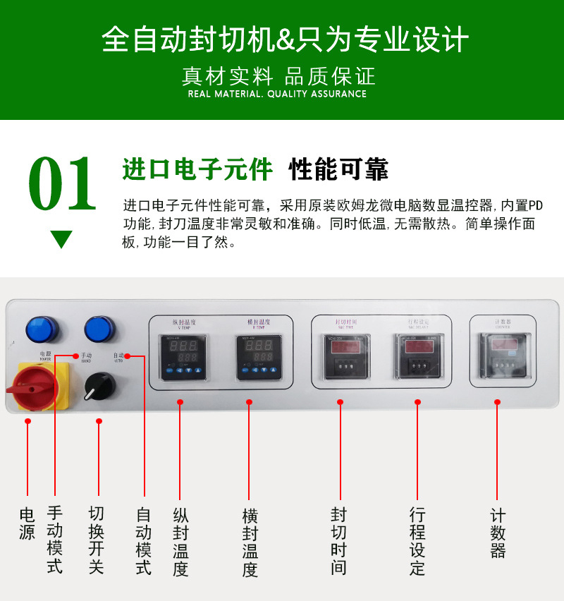 • 封切效果好:封刀采用美國杜邦特弗龍涂層抗粘耐高溫鋁合金刀,受熱均勻,不變形,封口線結實,不會開裂、焦化、冒煙,零污染,封口牢固且美觀134。