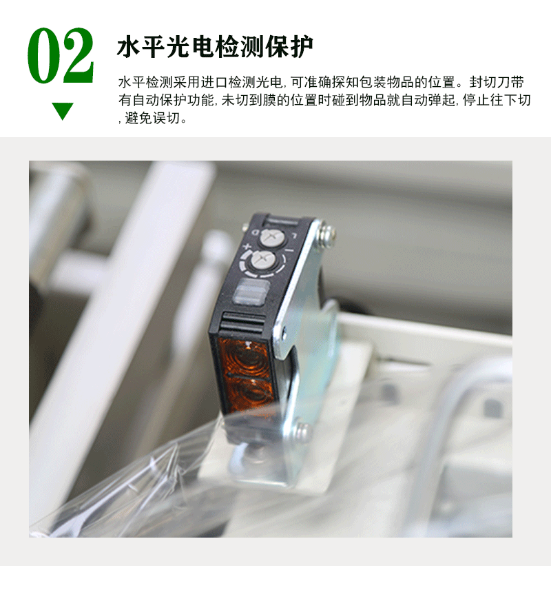 • 保護功能完善:封切部分裝有有機玻璃保護罩,并帶有自動報警功能,可大大提高操作者的安全性。封切刀帶有自動保護功能,能有效防止誤切包裝物14。