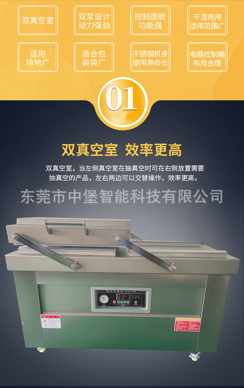 • 考慮需要包裝產(chǎn)品的最大尺寸。雙室真空包裝機(jī)的真空室有一定的尺寸限制,要確保產(chǎn)品和包裝袋能夠順利放入真空室進(jìn)行包裝。同時(shí),還要考慮包裝的類型,是普通的三邊封、四邊封還是異形包裝等。有些機(jī)器可能對特定的包裝類型支持更好,例如,帶有異形模具的雙室真空包裝機(jī)可以更好地處理異形包裝袋。