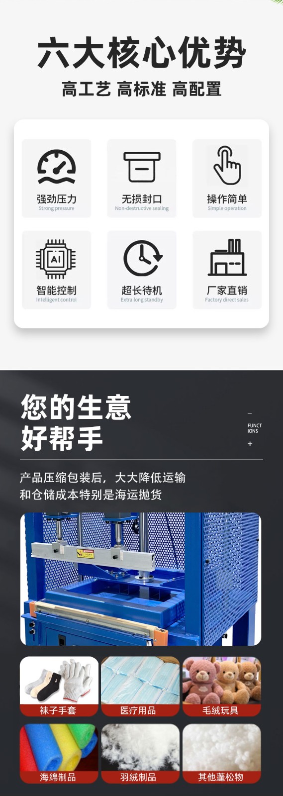• 全自動壓縮封口包裝機(jī):從物品輸送、包裝袋成型、壓縮、封口到成品輸出,整個過程都由機(jī)器自動完成。具有包裝速度快、精度高、穩(wěn)定性好等優(yōu)點(diǎn),適用于大規(guī)模生產(chǎn)的企業(yè),但設(shè)備價格較高。
