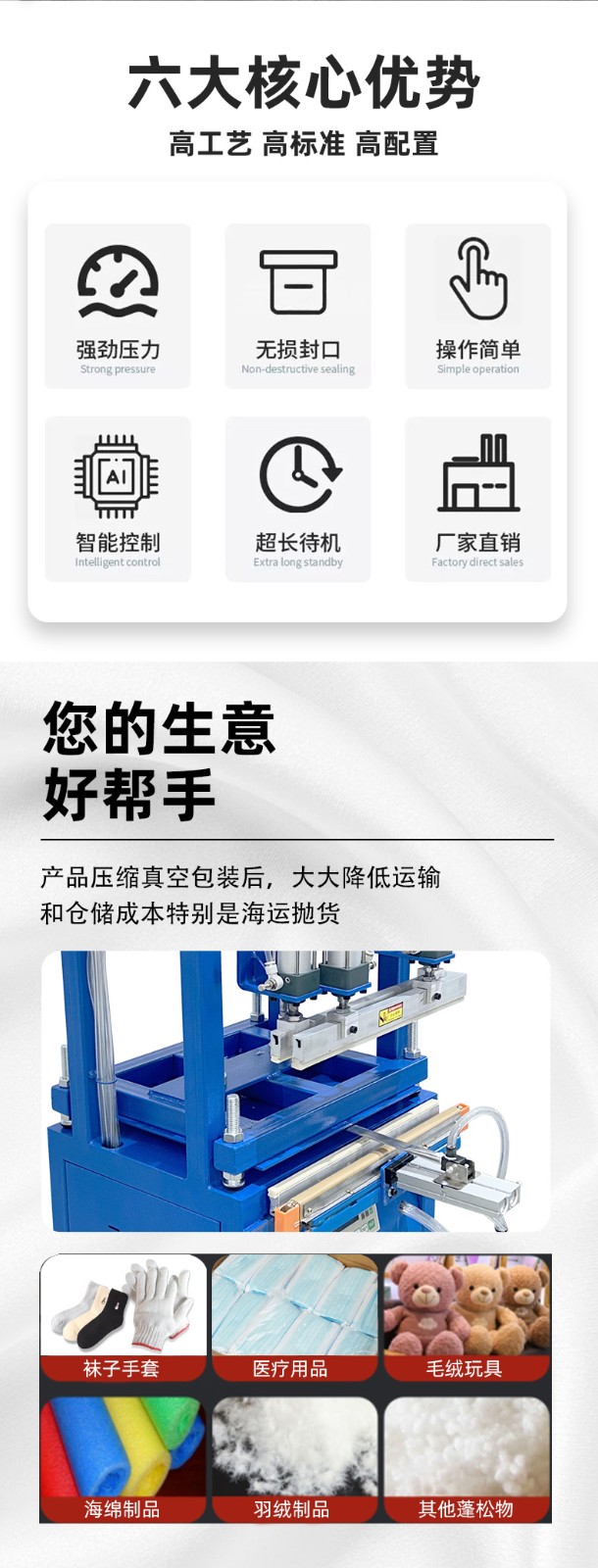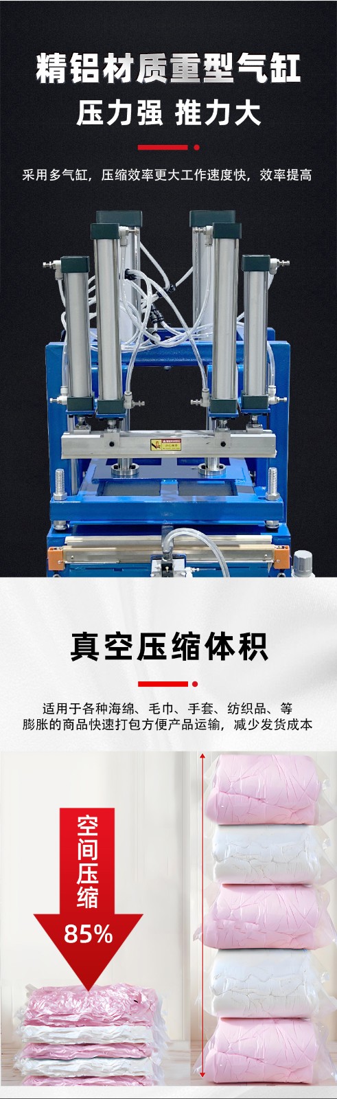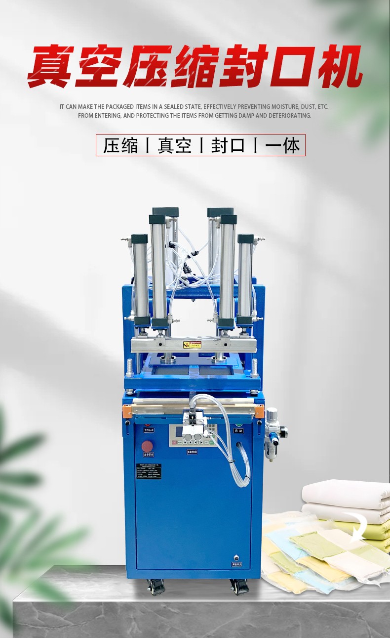 工作原理 抽氣:通過氣嘴或類似裝置,利用真空泵對包裝袋內的空氣進行抽真空作業,隨著包裝內及被包裝物中的空氣被抽出,包裝袋體積減小,從而達到壓縮包裝物體積的目的。 封口:在抽氣完成后,通過封口作業將包裝袋口封牢,防止空氣回流,出現漲袋的問題。 壓縮:部分機型還會采用氣缸壓縮產品的方式,將包裝袋內的空氣進一步排出去,使得包裝袋內部形成 “偽真空狀態”,從而裹緊產品或包裝件。 性能特點 縮小包裝空間:能極大地縮小蓬松物品的包裝體積,降低儲藏運輸成本。 延長產品保質期:包裝后的物品能達到密封、防潮、防污染等功能,
