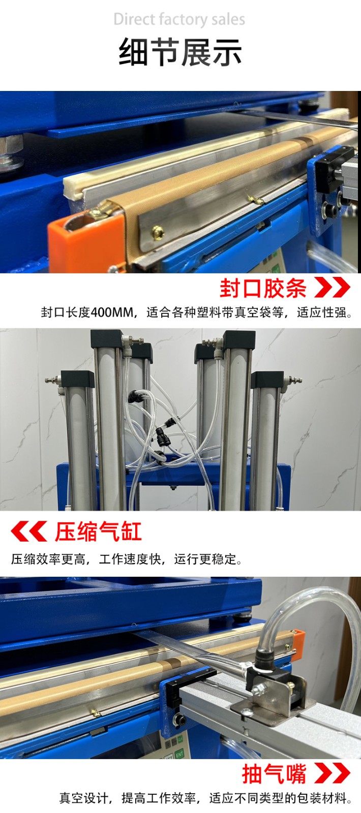 • 壓縮(部分機型):一些真空壓縮封口機在抽氣后會利用氣缸等裝置對包裝袋進行壓縮,進一步排出袋內空氣,使被包裝物更加緊實,減小包裝體積。
