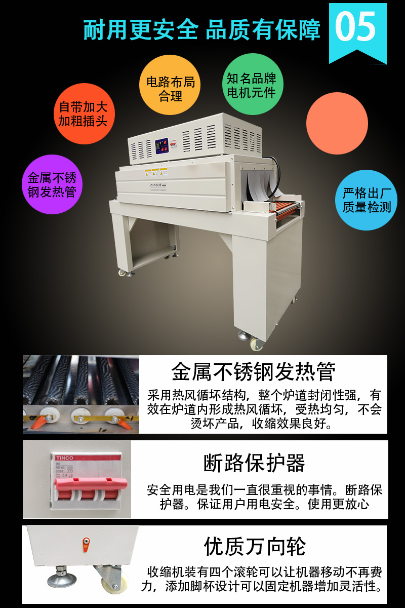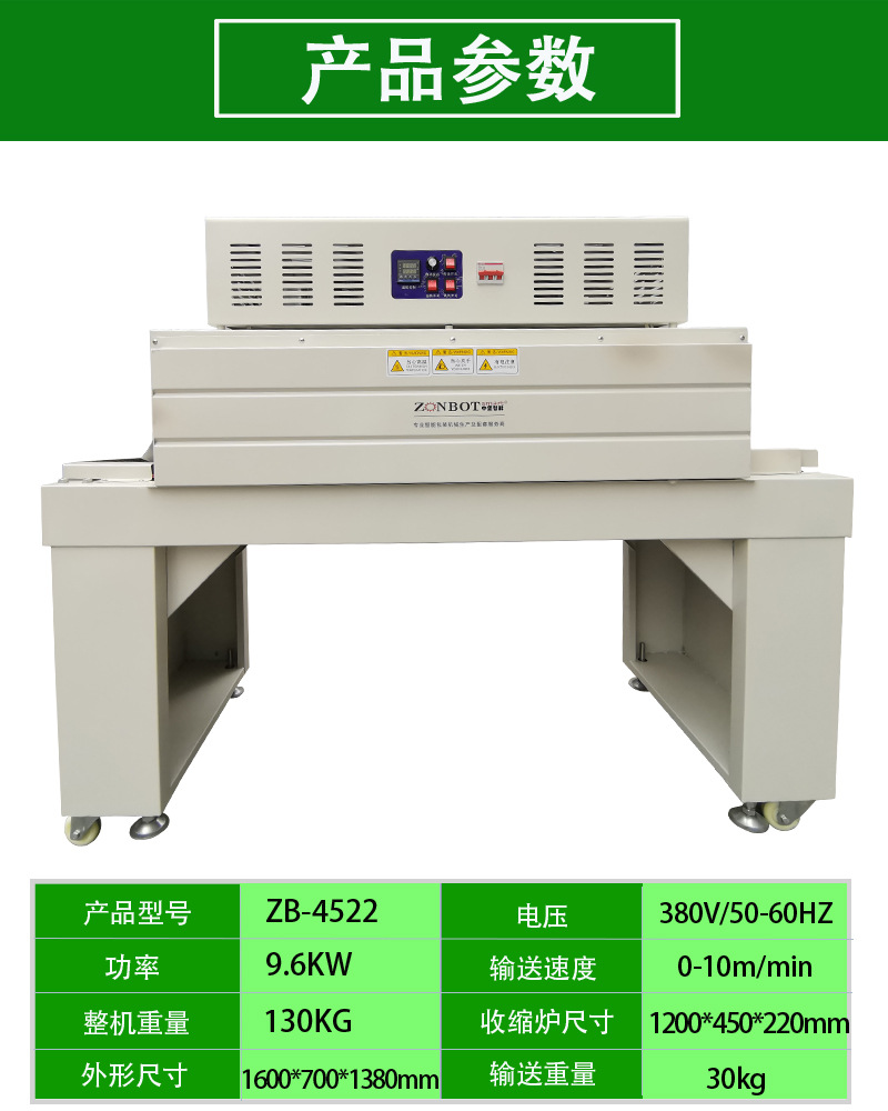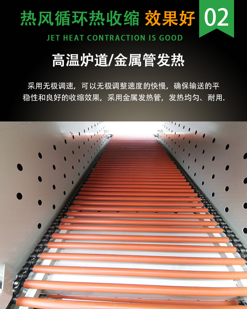 PRODUCT CENTER熱收縮機(jī)它是一種用于物品包裝的設(shè)備,通過(guò)加熱和收縮包裝帶,將產(chǎn)品緊密包裹起來(lái),達(dá)到保護(hù)產(chǎn)品、延長(zhǎng)產(chǎn)品壽命、促進(jìn)銷售的目的。是一款功能強(qiáng)大、實(shí)用性廣泛的設(shè)備,在現(xiàn)代生產(chǎn)生活中扮演著重要的角色。相信隨著科技的不斷發(fā)展,熱收縮機(jī)將會(huì)變得更加智能化、高效化,為我們的生活帶來(lái)更多的便利和驚喜,利用高溫?zé)嵩磳⑽锲愤M(jìn)行自動(dòng)收縮包裝的設(shè)備。廣泛的應(yīng)用于食品、醫(yī)藥、化妝品、電子產(chǎn)品等多個(gè)行業(yè)。使得包裝物品更加美觀、密封、防潮、防腐。