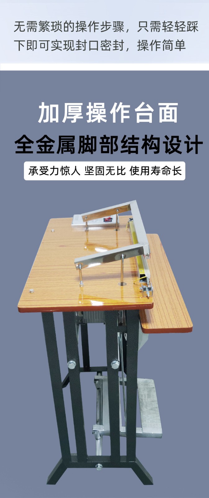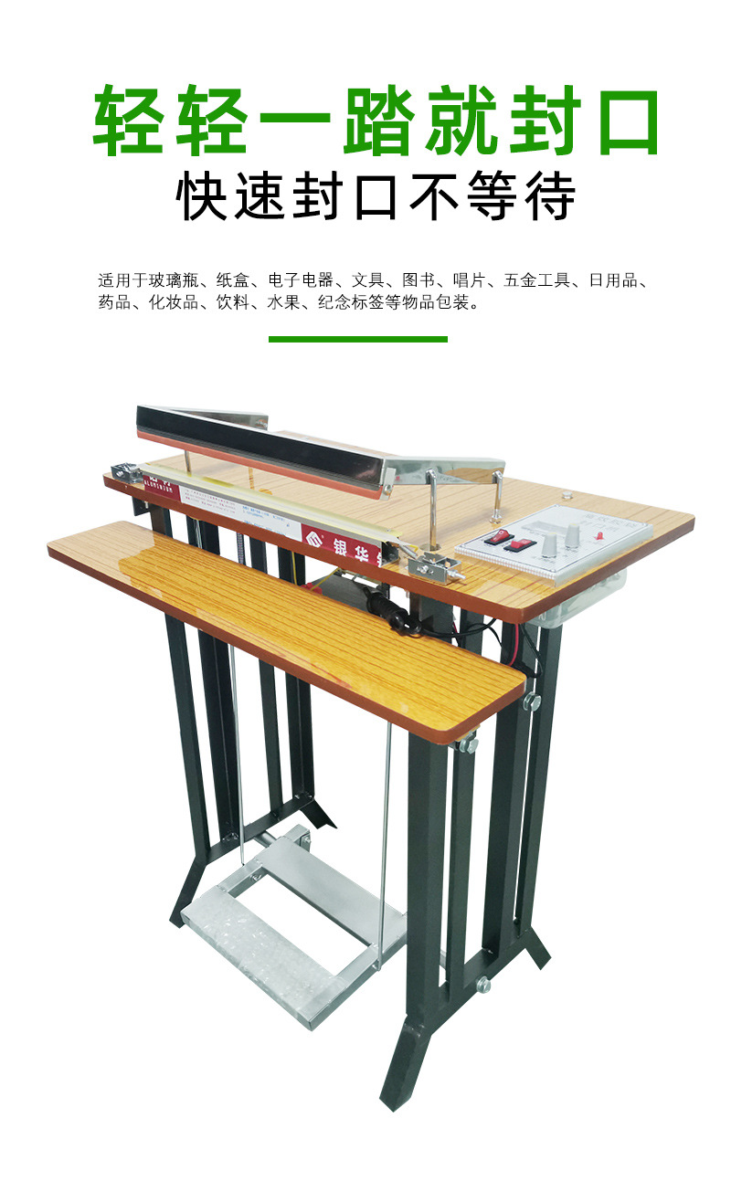 腳踏式封口機適用于各種塑料薄膜、復合薄膜及鋁塑薄膜的封合。產品簡介 可廣泛應用于食品、土特產、糖果、茶葉、醫藥、五金等行業。技術參數 產品優點 1、本品適用于藥品,化妝品,保健品,食品,潤滑油,農藥,蜂蜜,瓜子,洗衣粉,大棗,調味品,雞精等