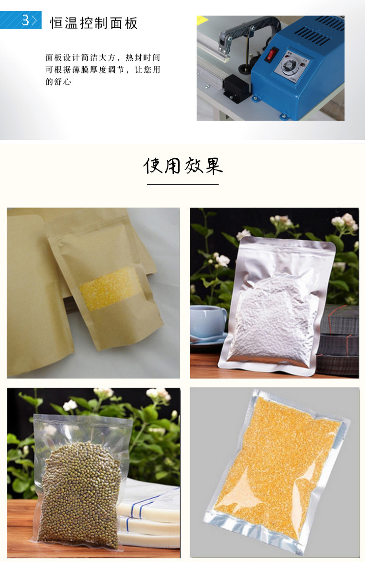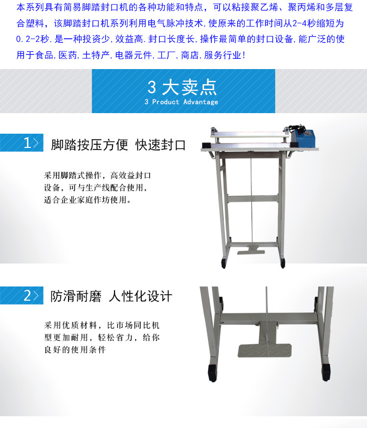 腳踏式封口機適用于各種塑料薄膜、復(fù)合薄膜及鋁塑薄膜的封合。產(chǎn)品簡介 可廣泛應(yīng)用于食品、土特產(chǎn)、糖果、茶葉、醫(yī)藥、五金等行業(yè)。技術(shù)參數(shù) 產(chǎn)品優(yōu)點 1、本品適用于藥品,化妝品,保健品,食品,潤滑油,農(nóng)藥,蜂蜜,瓜子,洗衣粉,大棗,調(diào)味品,雞精等